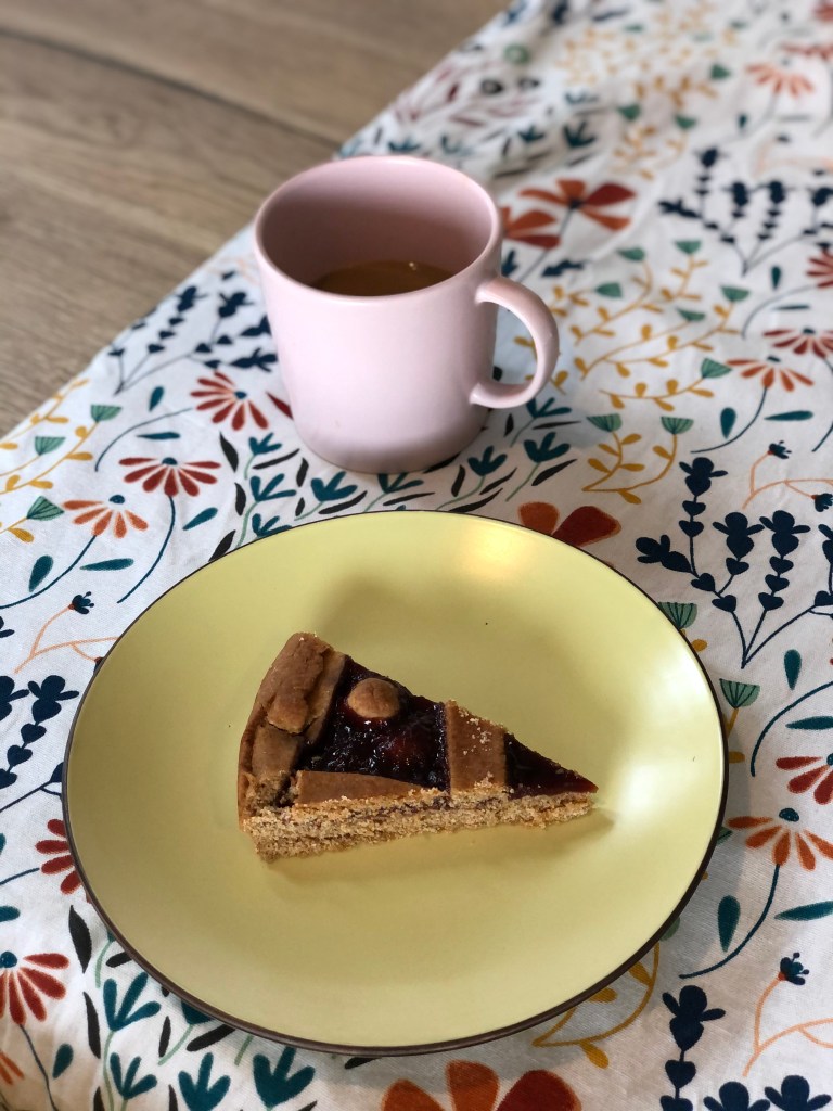Stendere la frolla in una teglia già foderata da carta da forno. Aggiungere una confettura a piacere (io ne ho usata una ai lamponi).